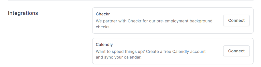 You can also connect to Checkr through Account settings > Security & privacy by viewing the Integrations section. Select Connect.