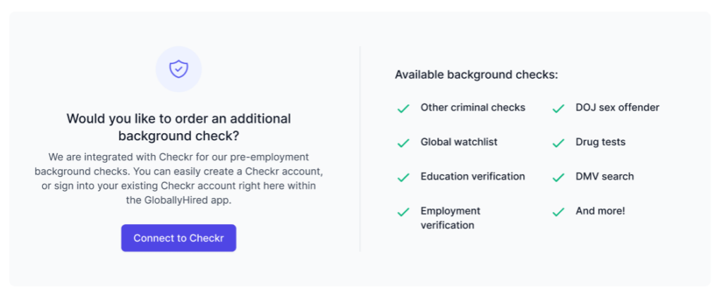 Through Checkr you can run a variety of background checks to meet your hiring requirements.