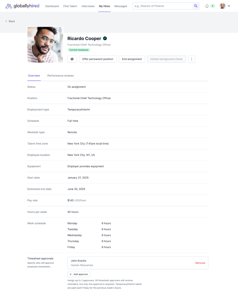 Our team connects you with pre-vetted fractional executives tailored to your leadership needs. Chat in real-time, seamlessly schedule interviews with our integrated calendar, and instantly make offers to bring talent on board—all on one platform.